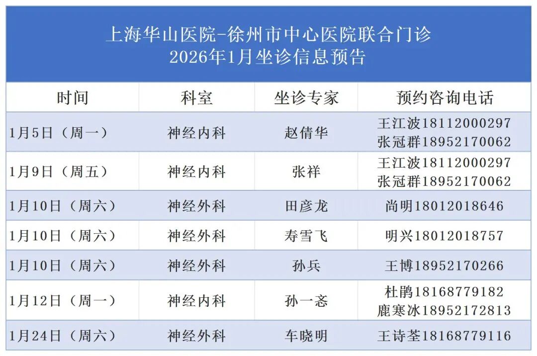 2026年1月,上海華山醫(yī)院神經(jīng)內(nèi)科、神經(jīng)外科專家坐診“上海華山醫(yī)院-徐州市中心醫(yī)院聯(lián)合門診”,專家號(hào)源陸續(xù)發(fā)放,具體信息如下: